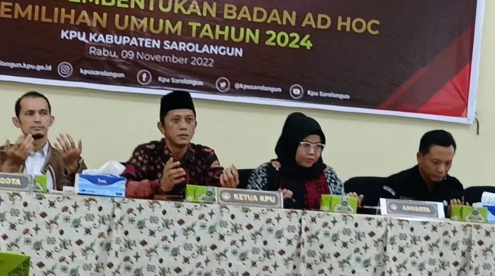 Dalam sosialisasi pembentukan badan Ad Hoc Pemilu 2024, pihak KPUD kabupaten Sarolangun menghadirkan satu komisioner KPU provinsi Jambi, komisioner KPUD Sarolangun serta melibatkan perwakilan dari Organisasi Kepemudaan (OKP), Organisasi kemasyarakatan (Ormas) beserta insan pers.