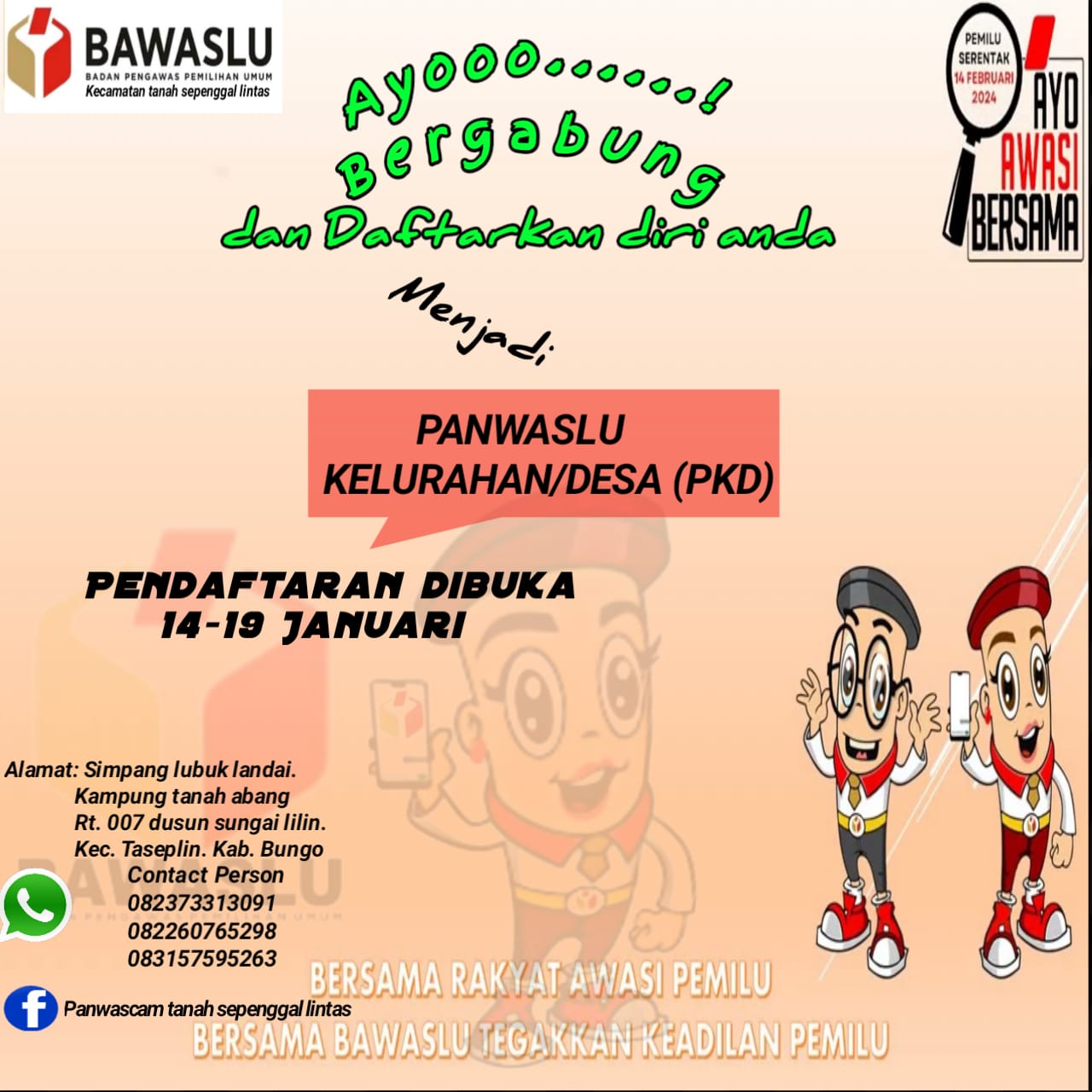 SUMBERNEWS, BUNGO – Panitia Pengawas Pemilihan Umum Kecamatan (Panwaslucam) Tanah Sepenggal Lintas (Taseplin) mensosialisasikan perekrutan Panwaslu Kelurahan / Desa (PKD) untuk menghadapi pemilu serentak tahun 2024.