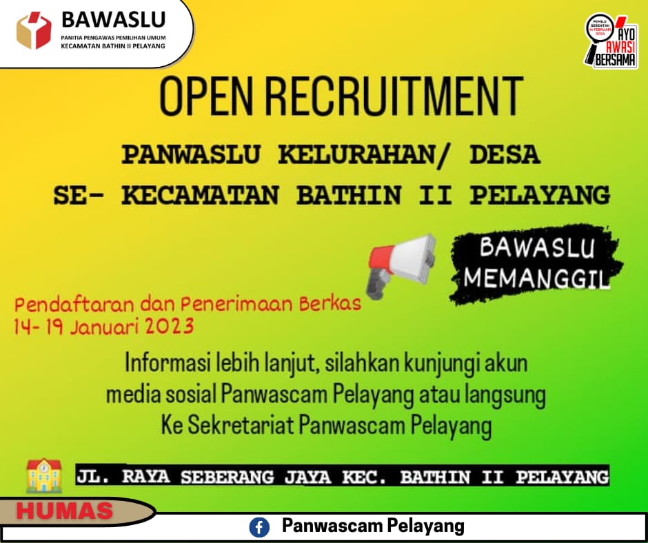 “Untuk pendaftaran dan penerimaan berkas akan di mulai dari tanggal 14-19 Januari 2023, mari kepada seluruh masyarakat di Kecamatan Bathin II Pelayang agar ikut berpartisipasi dan menjadi bagian penyelenggara Pemilu Serentak Tahun 2024 mendatang,” ujarnya.