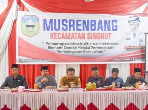 ”Seperti Aula Kantor camat singkut ini, kebutuhan untuk perlu diperluas kan pak dewan. Mari bapak dan ibu usulkan, dan kita sinkronkan dengan renja SKPD dan reses DPRD. Intinya kami ingin sekali dapat memenuhi kebutuhan yang bapak dan ibu butuhkan, tapi oleh karena keterbatasan keuangan daerah. Per hari kita memiliki pegawai honorer 4.614 orang pegawai, artinya biasa operasional pegawai honorer luar biasa setiap bulan,” katanya.