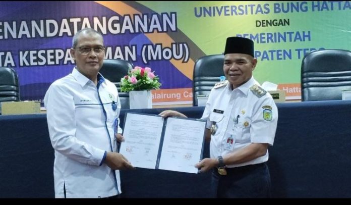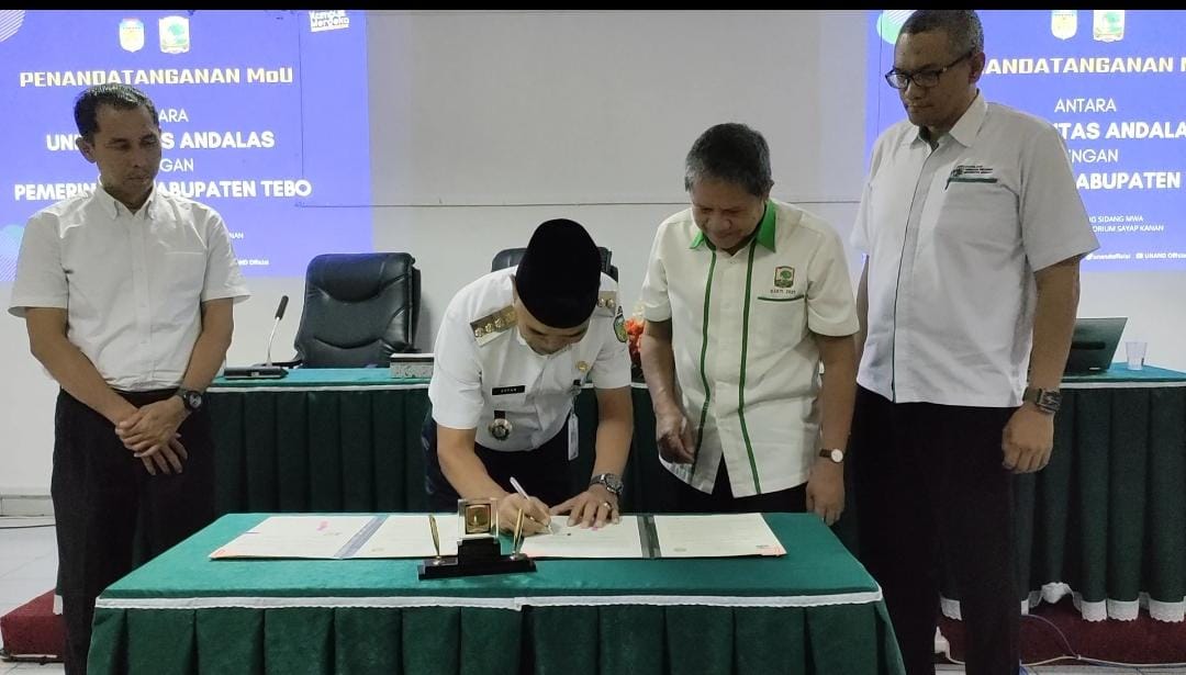 SUMBERNEWS. TEBO – Mengingat dari 11 kabupaten/kota di Provinsi Jambi, Kabupaten Tebo diketahui menduduki peringkat sembilan untuk indeks pembangunan manusia (IPM), untuk itu pj bupati tebo h aspan menandatangani memorandum of understanding atau mou/nota kesepemahaman di 3 perguruan tinggi di sumatra barat.