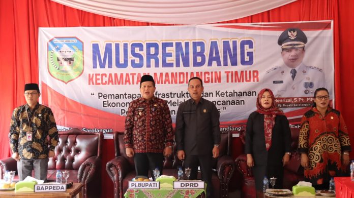 “Musrenbang kecamatan yang dilaksanakan pada hari ini merupakan amanat UU Nomor 25 Tahun 2004, sebagai bentuk upaya untuk melaksanakan rancangan pembangunan daerah dalam rangka meningkatkan kesejahteraan masyarakat. Maka usulan dari masyarakat di kecamatan Mandiangin timur tetap akan diupayakan sesuai dengan kewenangan dan kemampuan keuangan daerah,” ujarnya.