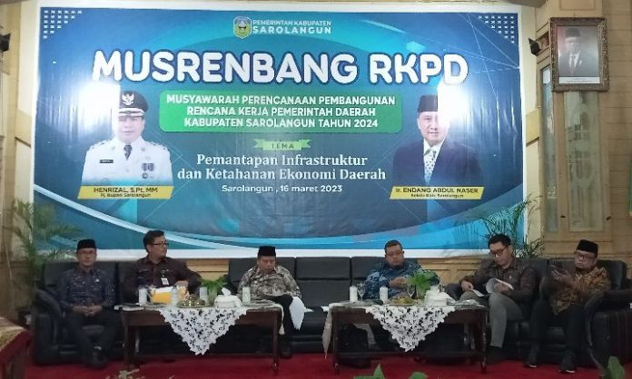 SUMBERNEWS, SAROLANGUN – Pemerintah Kabupaten Sarolangun melaksanakan kegiatan Musyawarah Perencanaan Pembangunan (Musrenbang) Rencana Kerja Pemerintah Daerah (RKPD) Kabupaten Sarolangun tahun 2024 di ruang pola Kantor Bupati Sarolangun, Kamis (16/03/2023).