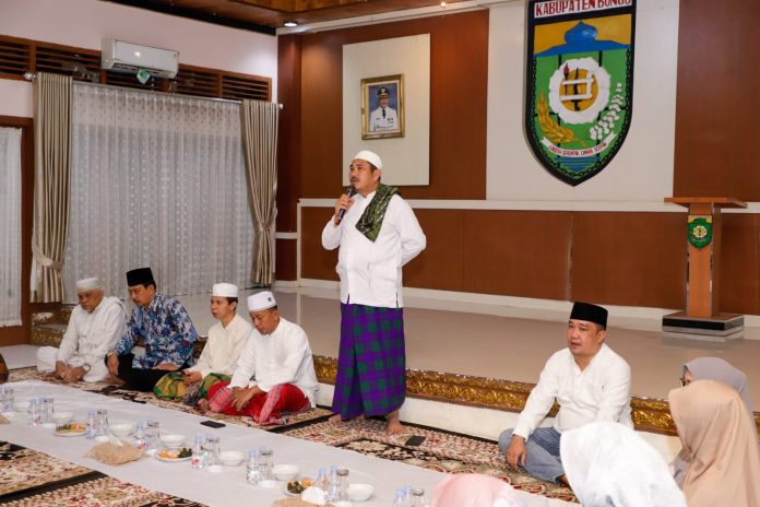 SUMBERNEWS, BUNGO – Sebagai bentuk rasa syukur atas segala nikmat yang telah di berikan oleh sang pencipta sehingga bisa bertemu kembali dengan bulan Suci Ramadhan, sekaligus guna memperkuat silaturahmi serta menjadi media bisa saling maaf-memaafkan, Bupati Bungo H Mashuri, S.P,M.E gelar doa selamat dan syukur menyambut Bulan Suci Ramadhan 1444H, bertempat di wisma Alisudin, Rumah dinas Bupati Bungo, Jumat (17/03/2023) malam