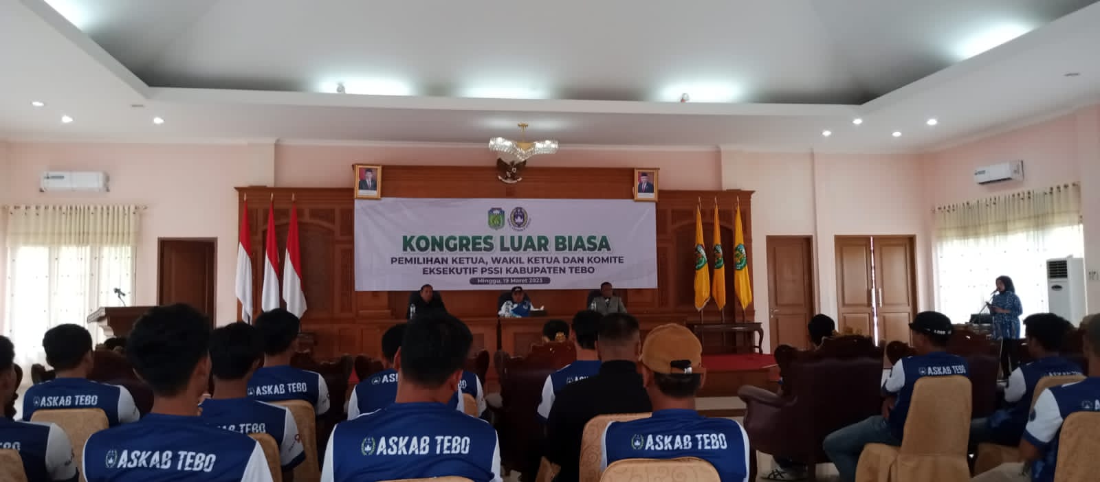 SUMBERNEWS, TEBO – Belokasi di Aula VIP Pendopo Rumah Dinas Bupati Tebo. Kongres Luar Biasa Pemilihan Ketua, Wakil Ketua dan Komite Eksekutif (Esko) Askab PSSI Kabupaten Tebo Minggu (19/03/2023), dibuka secara langsung oleh H Aspan PJ Bupati Tebo.