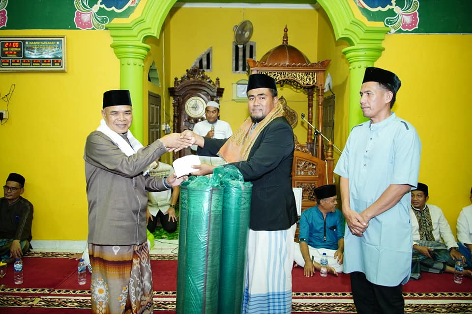 Dalam kesempatan ini H. Aspan menyerahkan bantuan berupa ambal Masjid, uang tunai dan satu set Bola Volly.