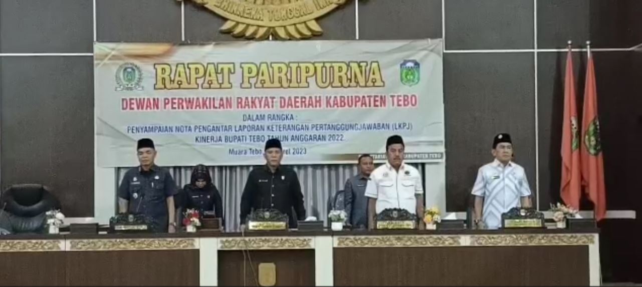 SUMBERNEWS, TEBO – DPRD Tebo menggelar Rapat Paripurna dengan agenda Nota Pengantar LKPJ kinerja Bupati Tebo Tahun Anggaran 2022, Rabu (29/03/2023).