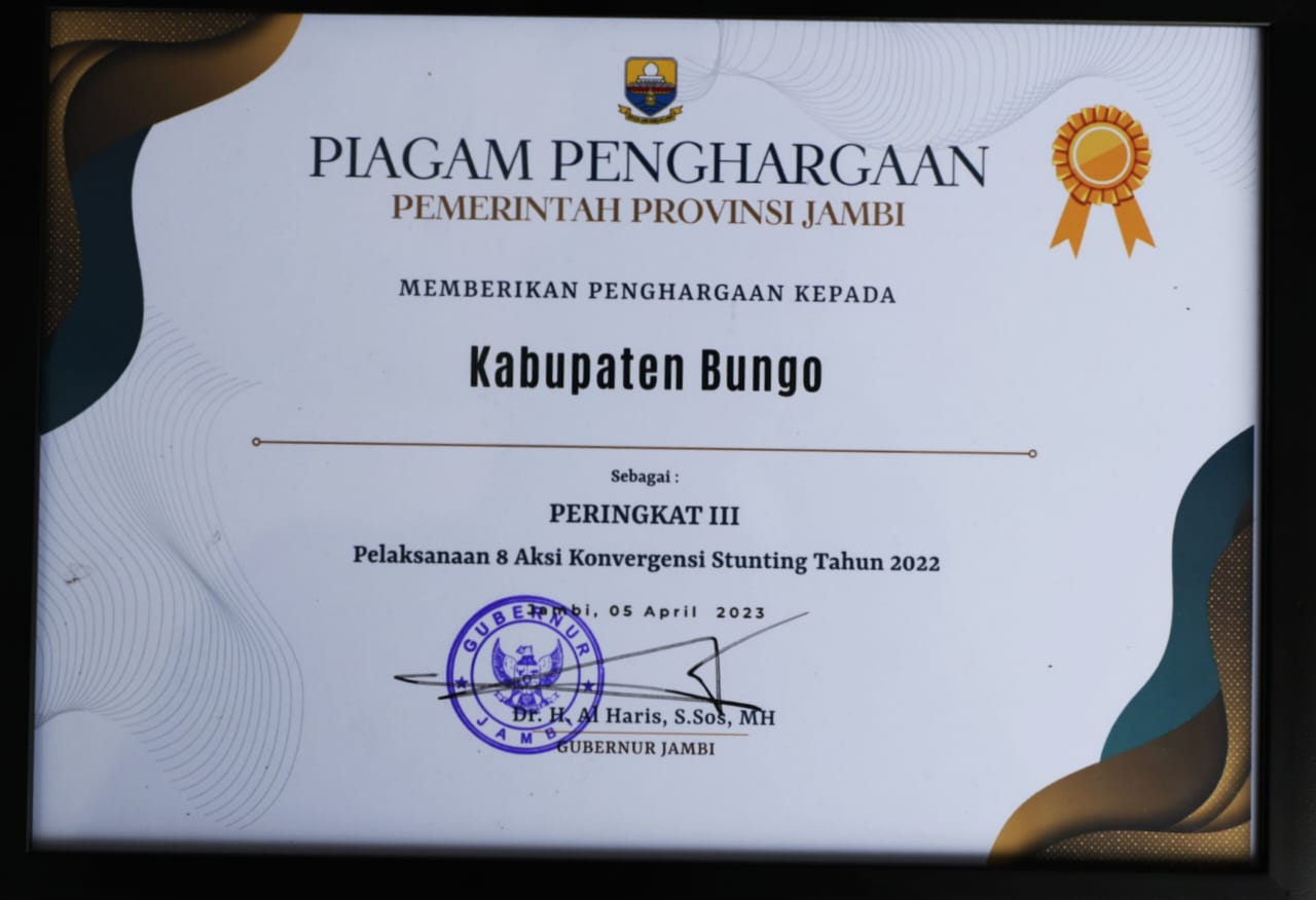 SUMBERNEWS, BUNGO – Kabupaten Bungo mampu raih peringkat ke-3 se-provinsi Jambi, terhadap pelaksanaan delapan aksi konvergensi Stunting tahun 2022. Untuk posisi pertama diraih Kabupaten Tanjung Jabung Barat, Kedua Kabupaten Merangin.