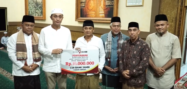 Pada kesempatan tersebut, Pejabat Bupati Bachyuni menyerahkan bantuan dari Baznas Muaro Jambi dan bantuan CSR Bank Jambi untuk Masjid Jami Darussalam sebesar 10 juta.