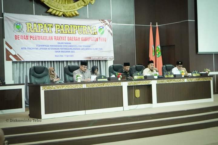 SUMBERNEWS, TEBO – Dewan Perwakilan Rakyat Daerah (DPRD) kabupaten Tebo, Selasa (11/04/2023) menggelar Rapat Paripurna dengan agenda pandangan akhir Fraksi terhadap Nota Pengantar LKPJ Bupati Tebo Tahun Anggaran 2022.