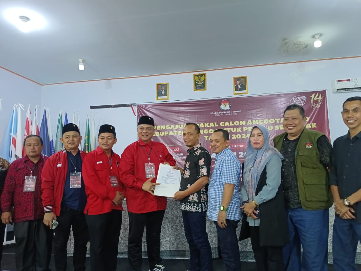 SUMBERNEWS, BUNGO – Pengurus dan kader PDI Perjuangan (PDI-P) kabupaten Bungo, Jumat (12/05/2023) sore mendatangi kantor KPU Bungo untuk mengantarkan berkas pencalonan Bakal Calon Legislatif (Bacaleg) Pemilu 2024 mendatang.