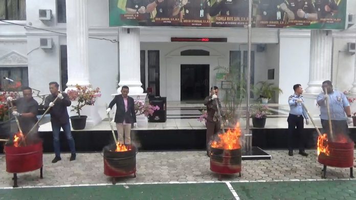 Pemusnahan barang bukti berlangsung di halaman kantor Kejaksaan Negeri (Kejari) Bungo, Jumat (14/07/2023) pagi.