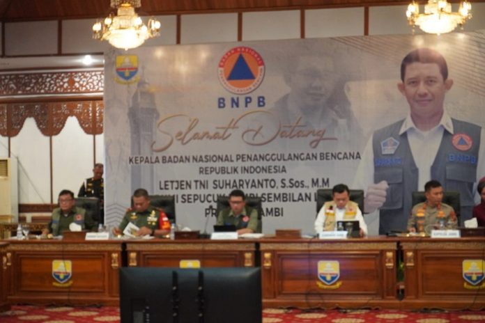 SUMBERNEWS, JAMBI – Pemerintah Provinsi Jambi melaksanakan Rapat Koordinasi (Rakor) Kebakaran Hutan dan Lahan (Karhutla) Provinsi Jambi Tahun 2023 bersama Kepala Badan Nasional Penanggulangan Bencana (BNPB) Republik Indonesia Letjen TNI Suharyanto.