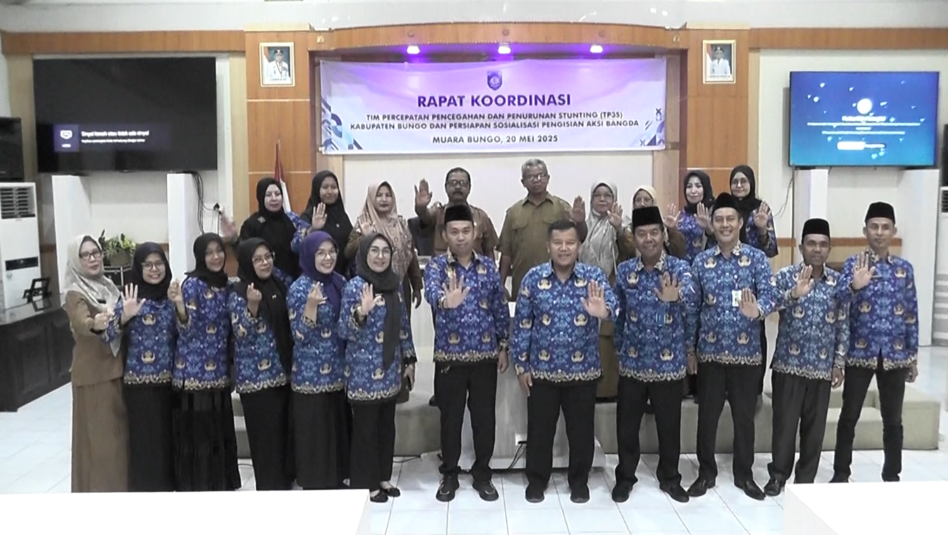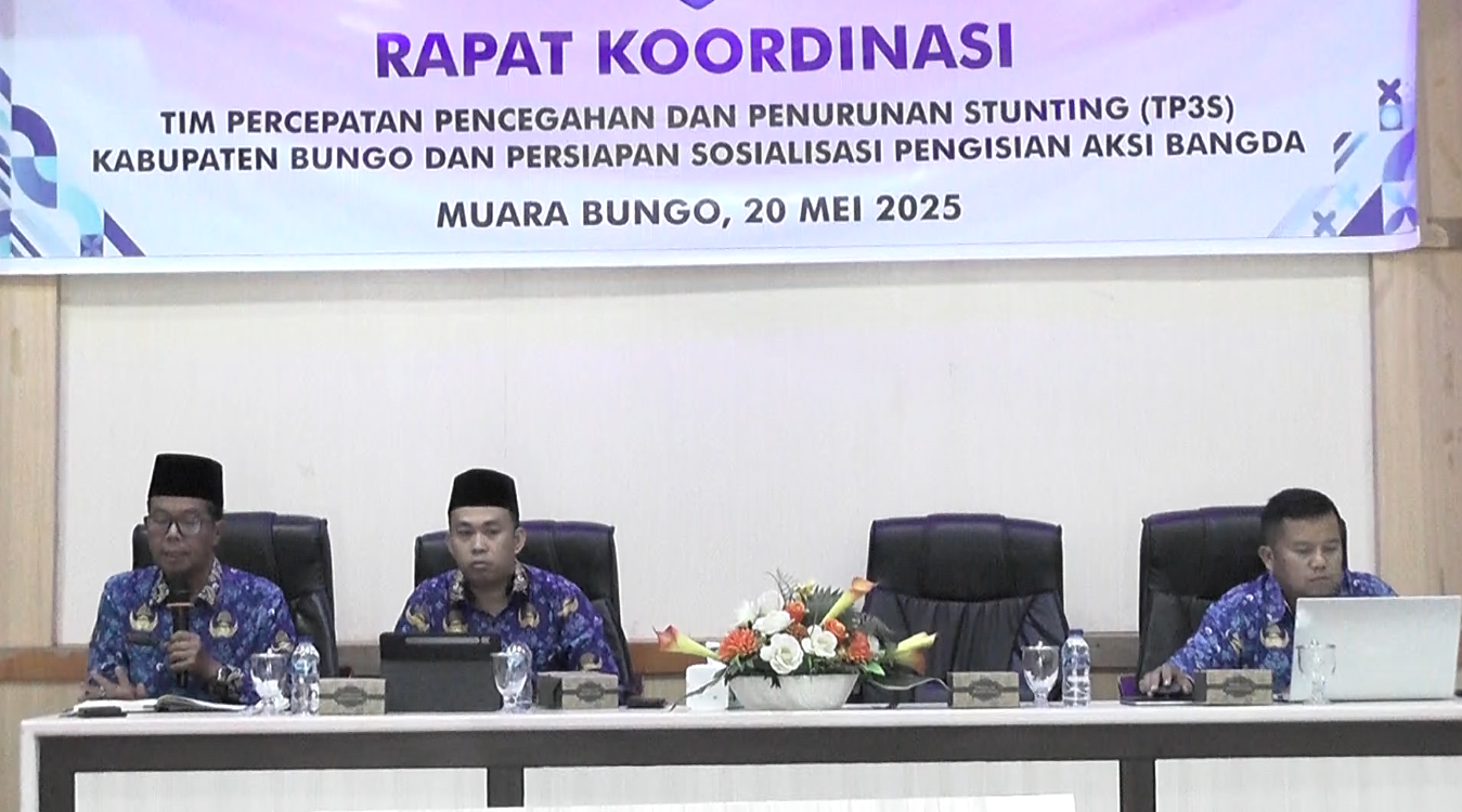 SUMBERNEWS, BUNGO – Tim Percepatan Pencegahan dan Penurunan Stunting (TP3S) Kabupaten Bungo menggelar rapat koordinasi dan rapat persiapan sosialisasi pengisian Aksi Bangda pada Selasa (20/05). Rapat berlangsung di Aula Bappeda Kabupaten Bungo dan dipimpin langsung oleh Sekretaris TP3S Ardani, serta dihadiri oleh lintas sektor, termasuk camat, koordinator KB, dan IPKB.