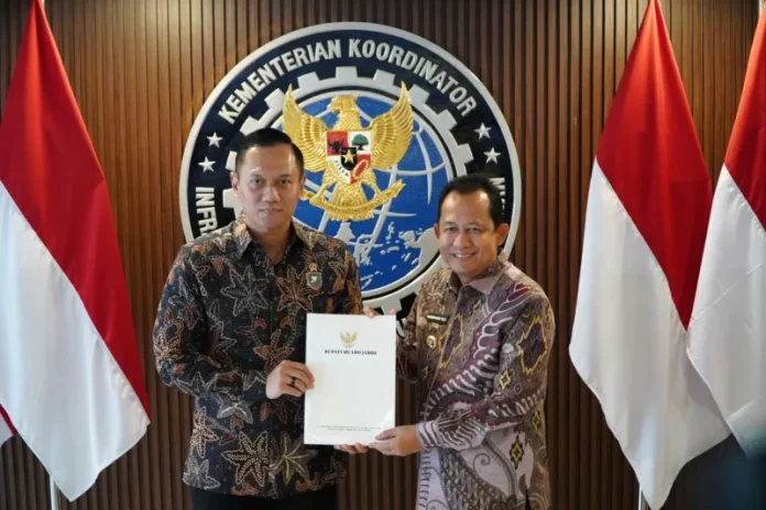 SUMBERNEWS, MUARO JAMBI – Bupati Muaro Jambi, Dr Bambang Bayu Suseno, SP, MM, M.Si, melakukan audiensi resmi dengan Menteri Koordinator Bidang Infrastruktur dan Pembangunan Kewilayahan Republik Indonesia, Mayor Inf. Purn. H. Agus Harimurti Yudhoyono, M.Sc, M.P.A, M.A., di Gedung Kemenko Infrastruktur dan Pembangunan Kewilayahan, Jakarta, Rabu (16/07).