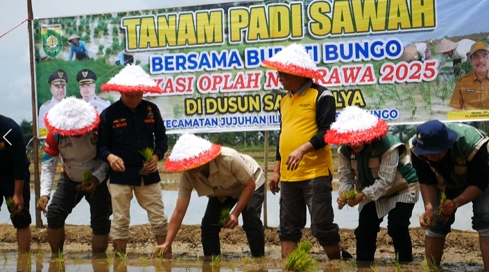 SumberNews, Bungo – Bupati Bungo, Dedy Putra menghadiri langsung kegiatan penanaman perdana padi di area kelompok tani Sari Mulya, Minggu 5 maret 2026. Padi yang ditanam kali ini bukan padi biasa, melainkan varietas Nutri Zinc.