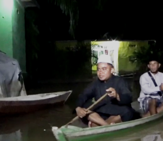 Ditengah Bencana Banjir, Warga Gunakan Perahu untuk Sholat Tarawih Berjamaah
